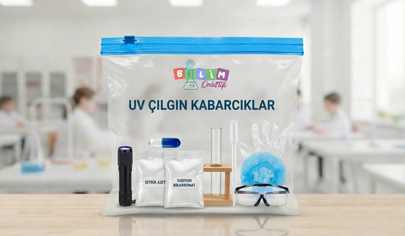 • Açıklama: Sitrik asit ve sodyum bikarbonatın tepkimesiyle oluşan gaz çıkışını, UV fenerin ışığı altında bir görsel şölene dönüştürüyoruz.