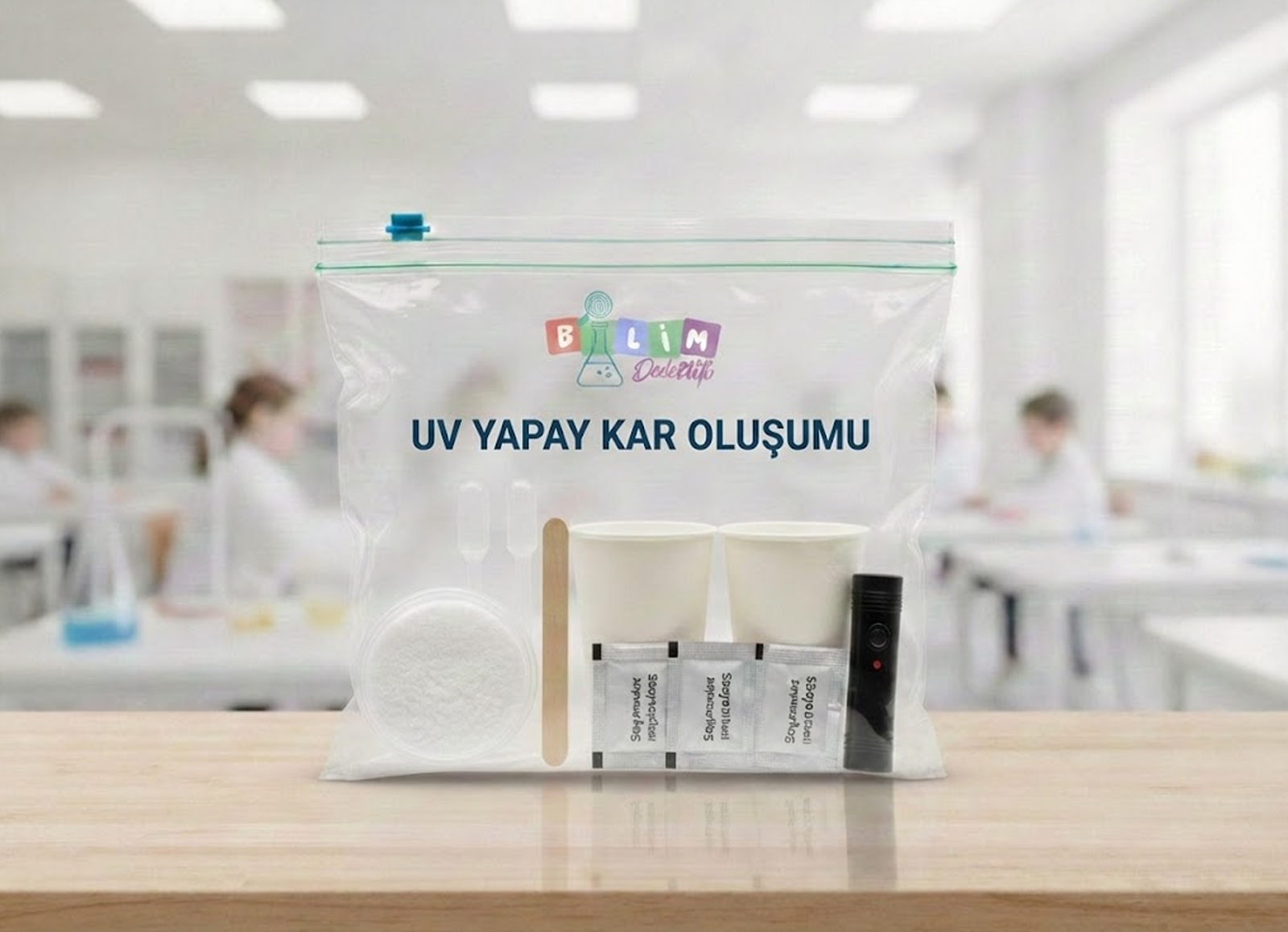 • Açıklama: Sodyum poliakrilatın inanılmaz su tutma kapasitesi ile saniyeler içinde yumuşacık bir kar oluşturuyoruz. UV boya ve fener desteğiyle bu karlar karanlıkta parlayan sihirli bir görünüme kavuşuyor.